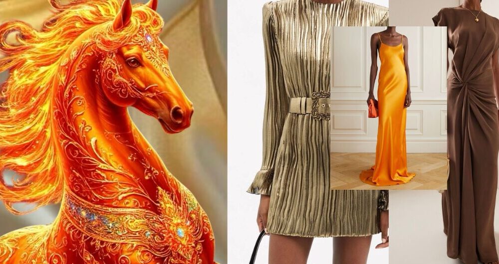 Подойдут наряды красных, оранжевых и золотых оттенков, которые можно дополнить бордовыми, терракотовыми, медными, коричневыми и золотыми деталями. Также актуальны металлик, шелк и бархат.