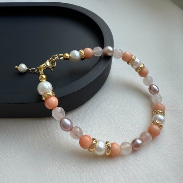 Браслет из коралла, розового кварца и жемчуга - нежный, женственный и в то же время выразительный браслет, созданный из натуральных камней: коралла персикового оттенка, розового кварца и жемчуга с деликатным переливом. Позолоченные разделители с фактурной гравировкой добавляют украшению утончённости и благородства.