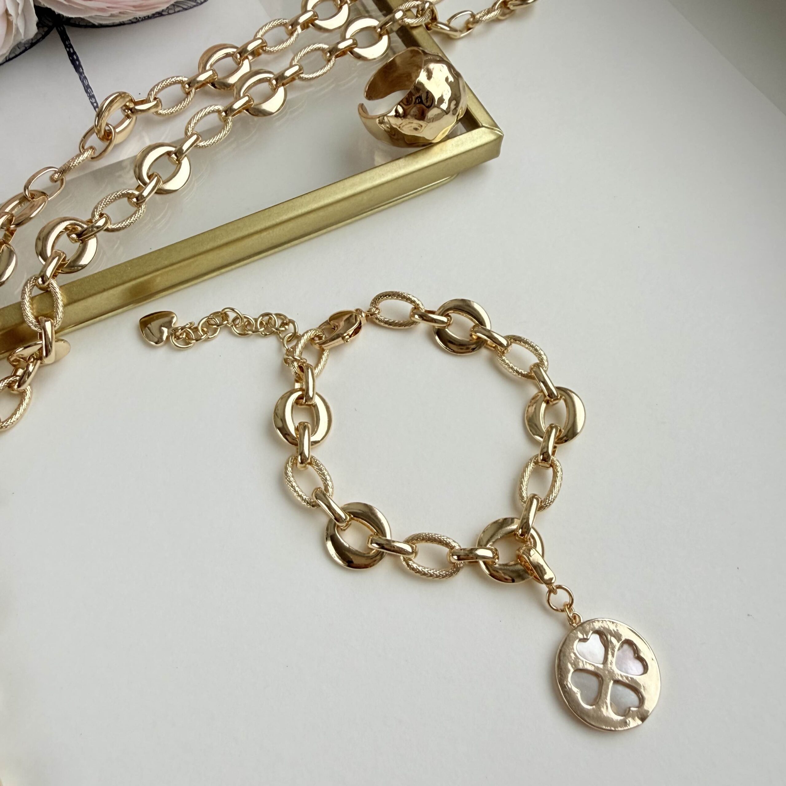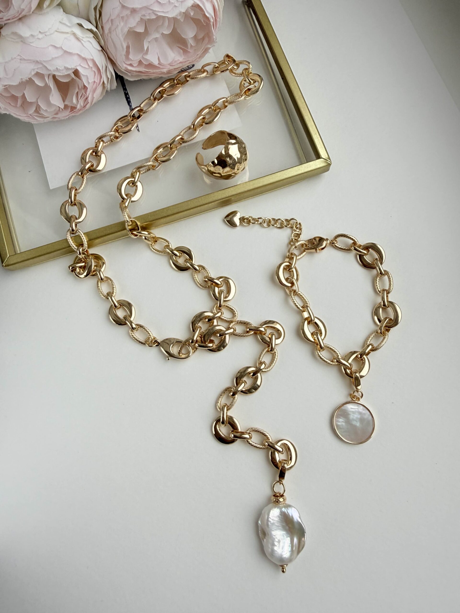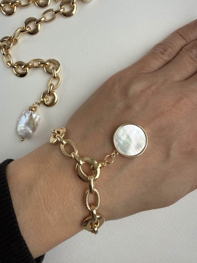 Крупные овальные звенья в тёплом золотистом оттенке образуют гармоничный ритм, сочетая гладкие и фактурные поверхности. Подвеска из натурального перламутра добавляет образу лёгкое мерцание и глубину, меняя оттенки в зависимости от света. Её лаконичная форма подчёркивает естественную красоту материала и делает браслет универсальным для разных образов.