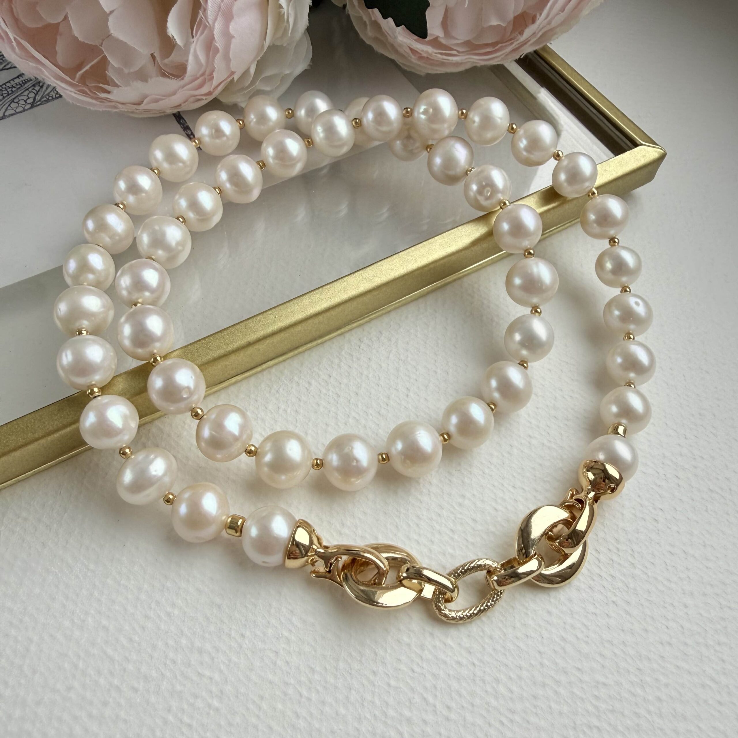 «Чистое сияние» так я назвала этот колье, так же есть серьги и кольцо к нему, в котором нет ничего лишнего, только мягкий блеск натурального жемчуга и тёплое блеск позолоченной фурнитуры.