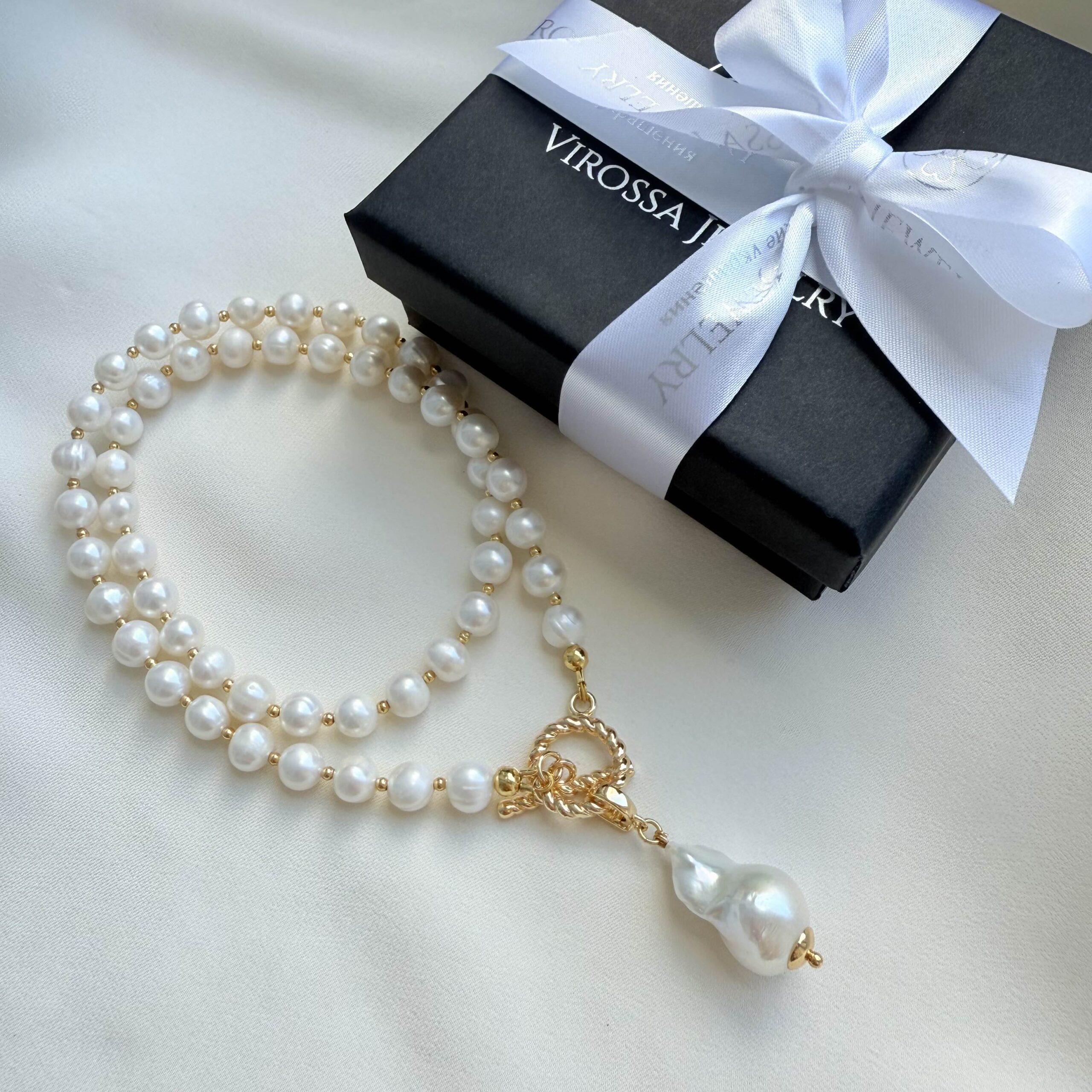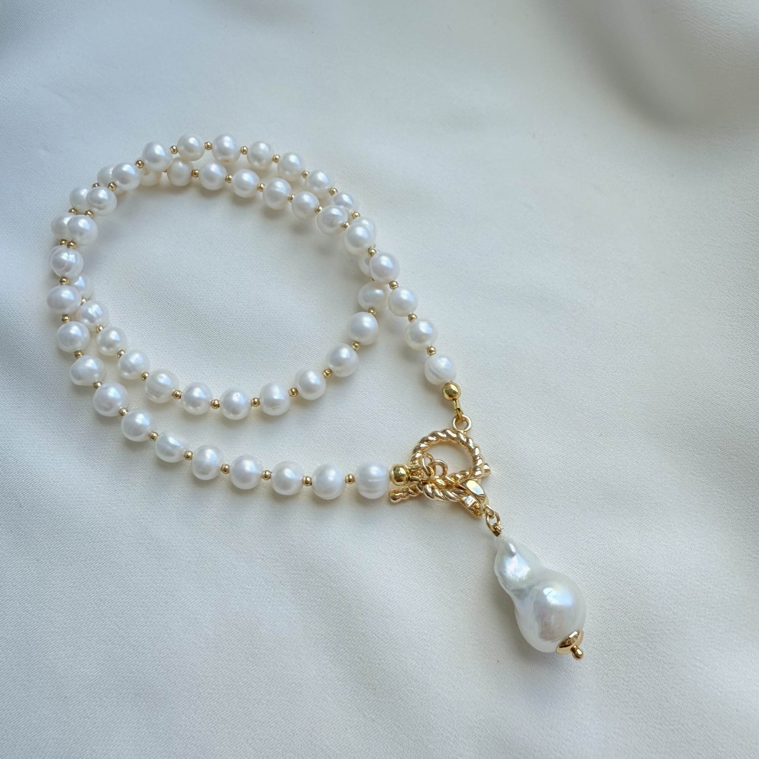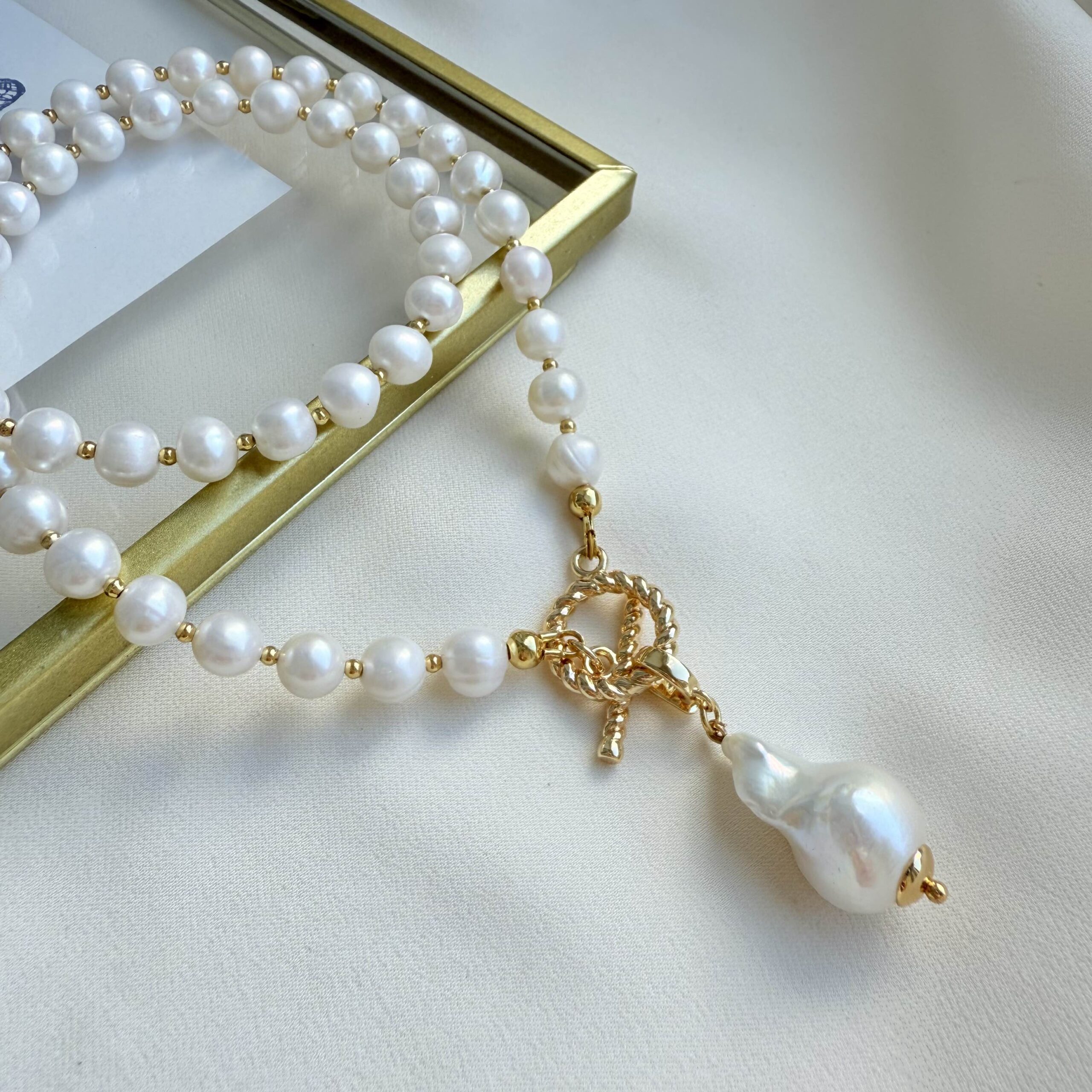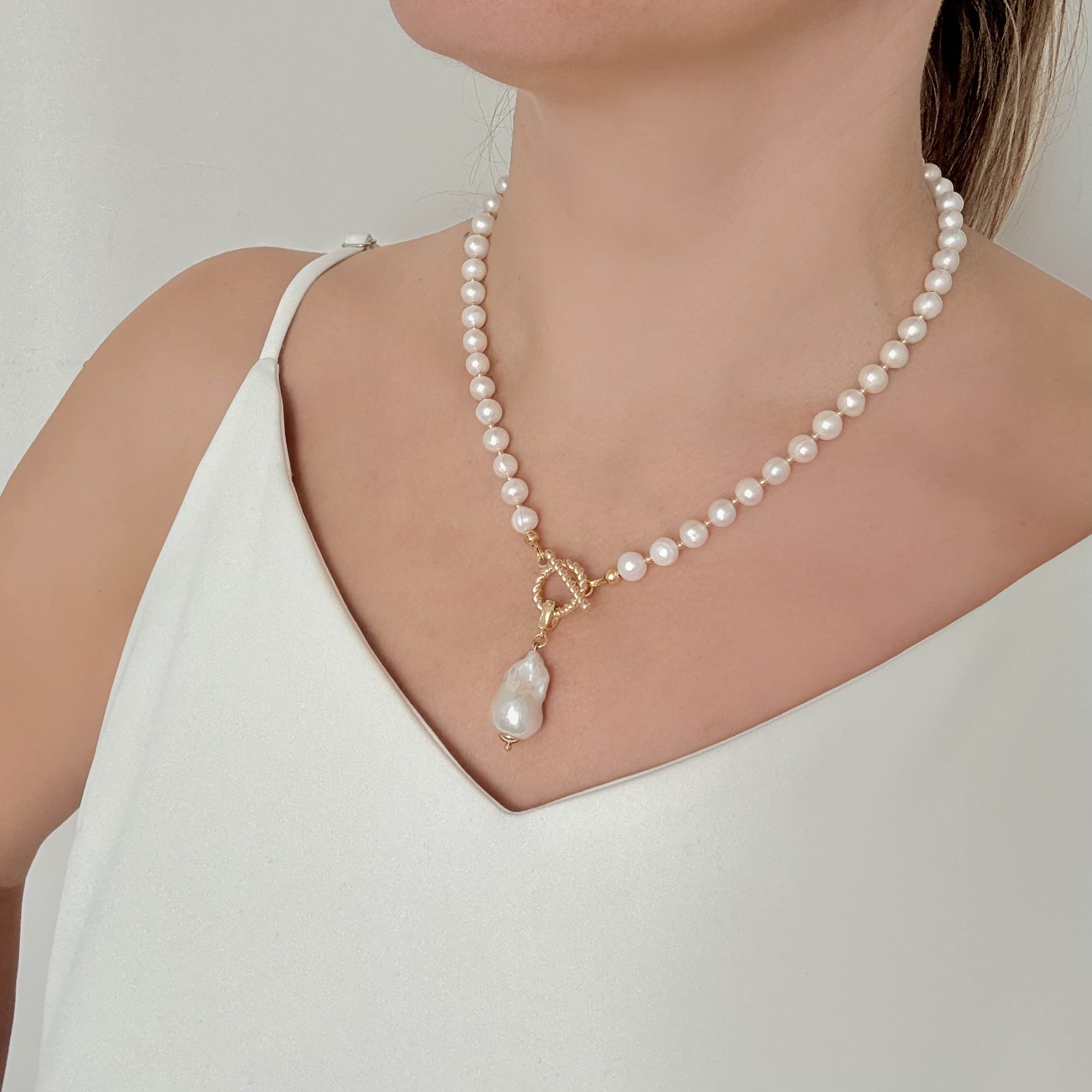 Колье из жемчуга с подвеской из барочной жемчужины — элегантное украшение, где классические жемчужные бусины сочетаются с уникальной формой барочной жемчужины. Лаконичный, но выразительный акцент для любого образа.