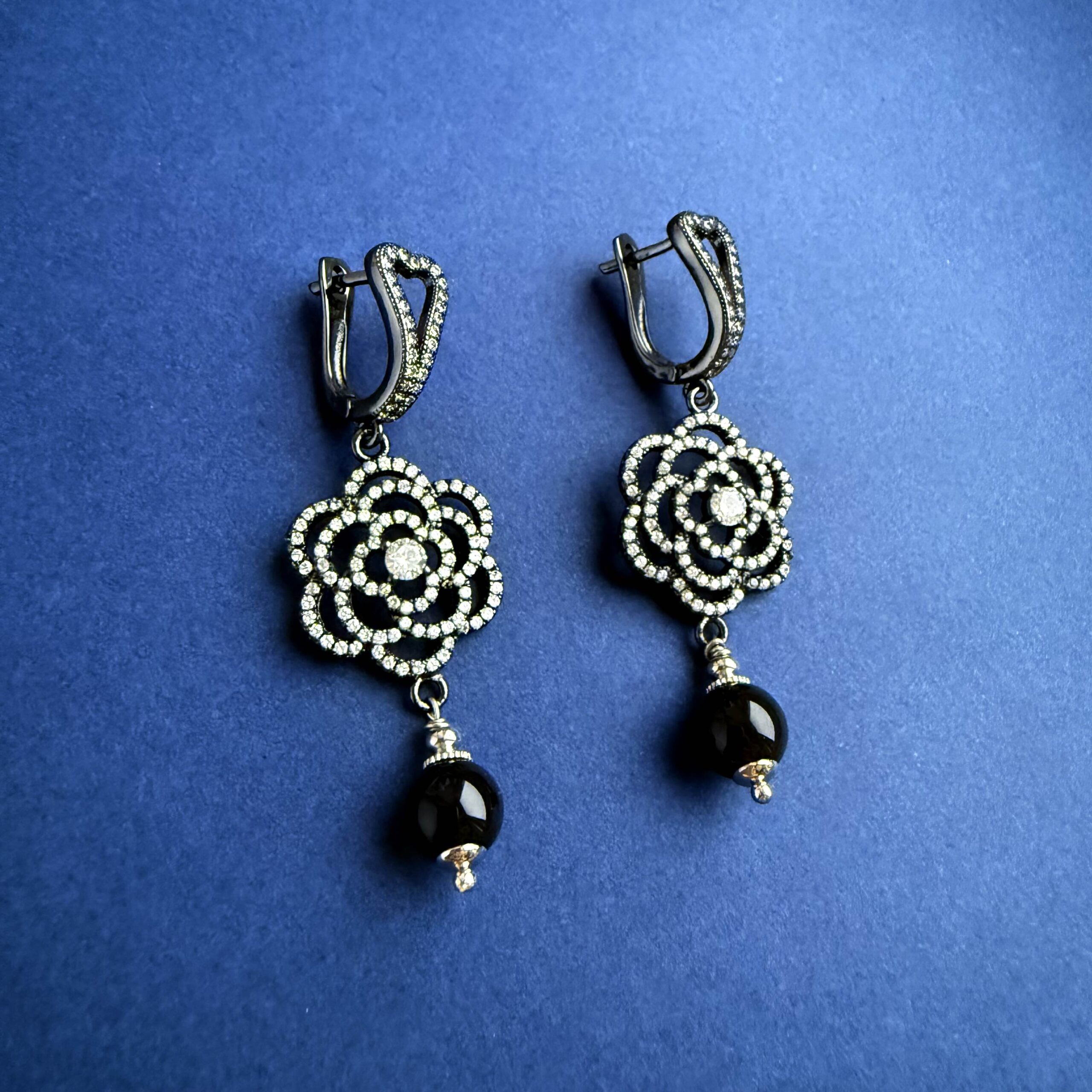 Серьги с декоративными цветочными элементами дополняют композицию, повторяя стиль и настроение колье. Капли агата придают образу глубину, а ажурный узор верхней части добавляет легкости.