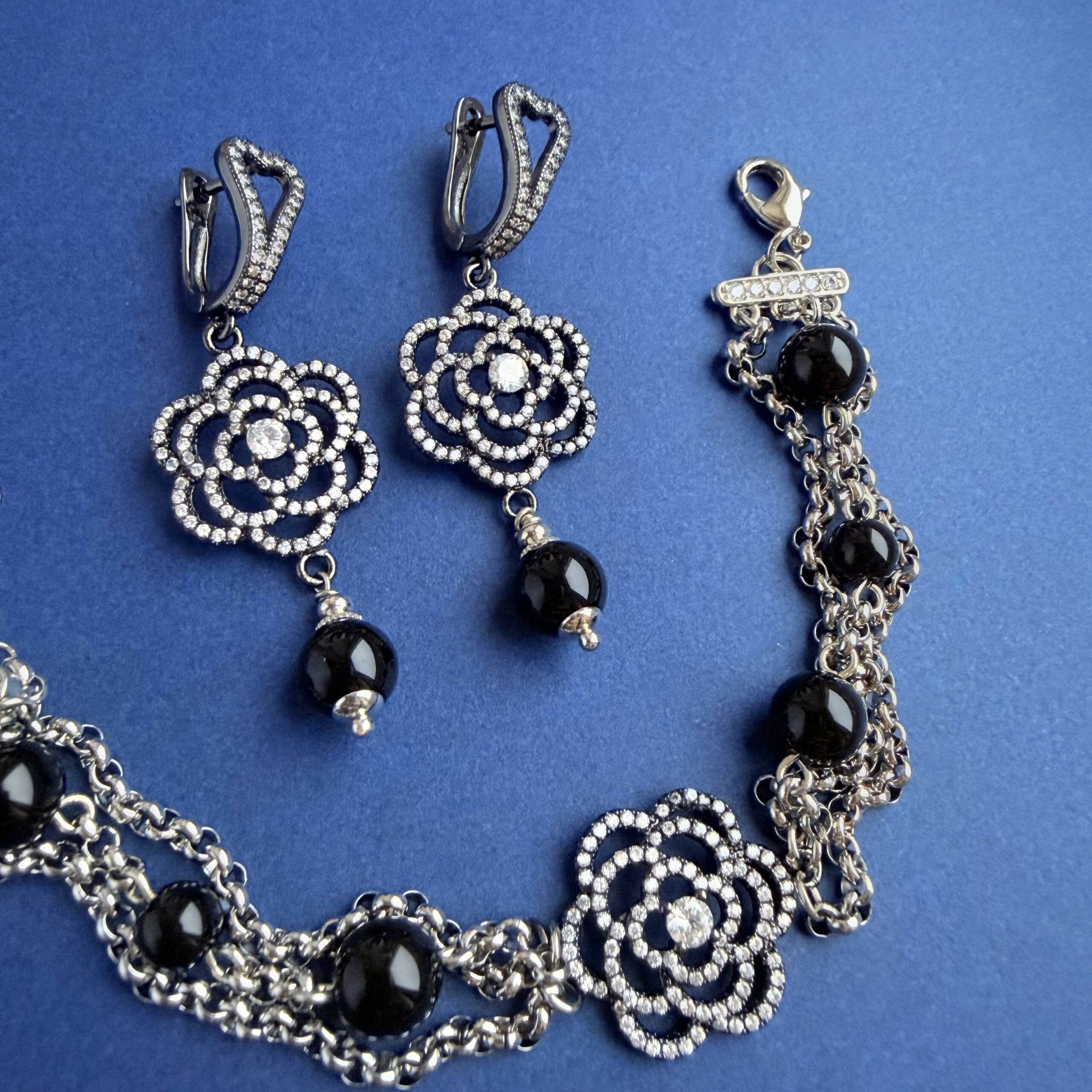 Браслет объединяет те же материалы — чёрный агат и блестящие металлические элементы — поддерживая целостность комплекта. Он комфортно ложится на запястье и легко регулируется по длине.