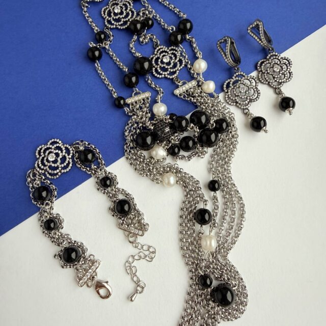 Комплект “Sharlotte” — это выразительное украшение в современном вечернем стиле, сочетающее контраст глубокого черного агата и мягкое сияние жемчуга. Каждая деталь создаёт гармоничную композицию, подчеркивающую утончённость и индивидуальность образа.