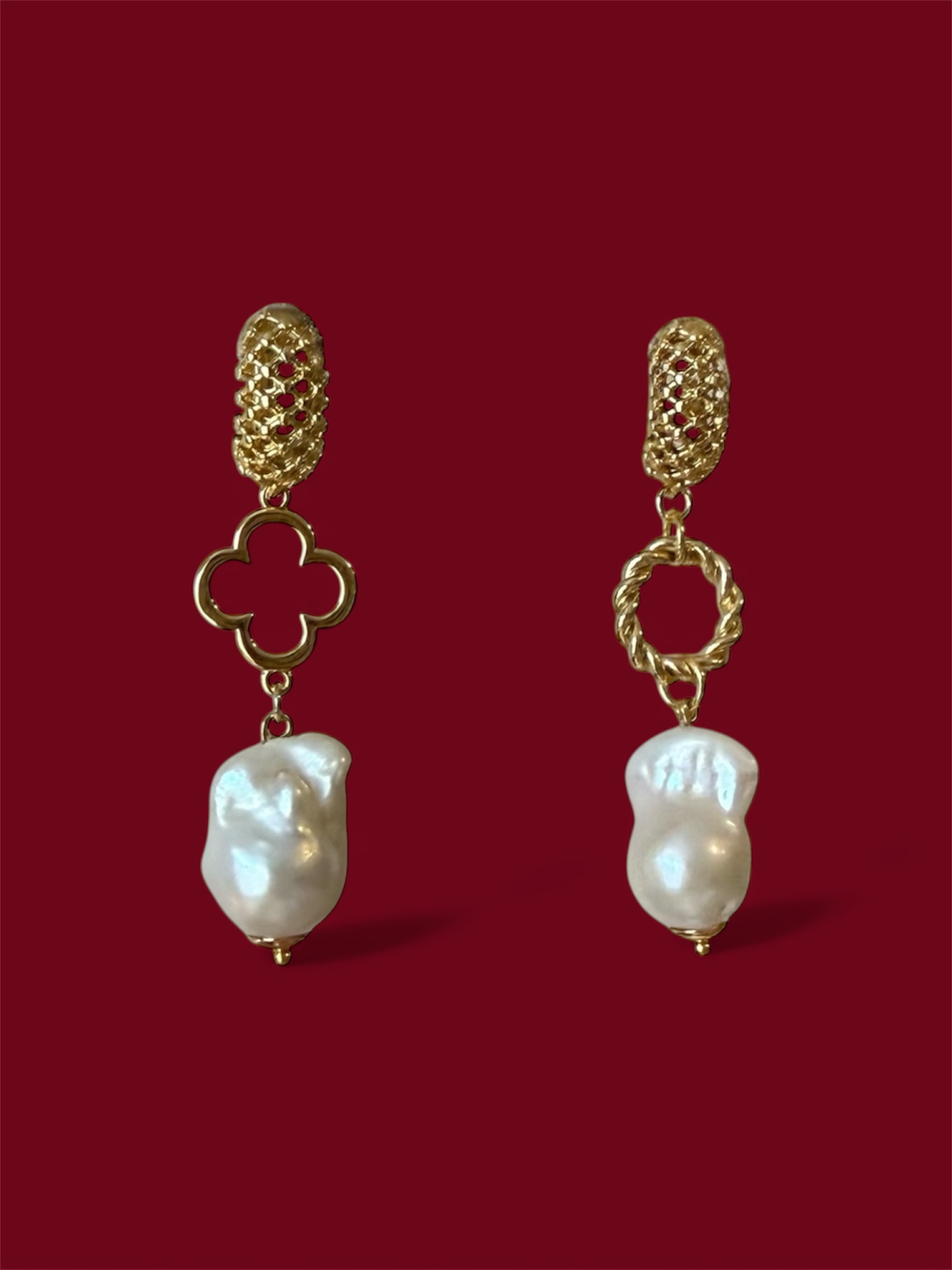Уникальная асимметрия — главная “изюминка”: одно украшение дополнено ажурным клевером, второе — фактурным кольцом. Такой дизайн подчёркивает индивидуальность и делает образ более смелым и модным. Неровная форма натурального жемчуга придаёт украшению естественность и неповторимость — двух одинаковых жемчужин не существует.