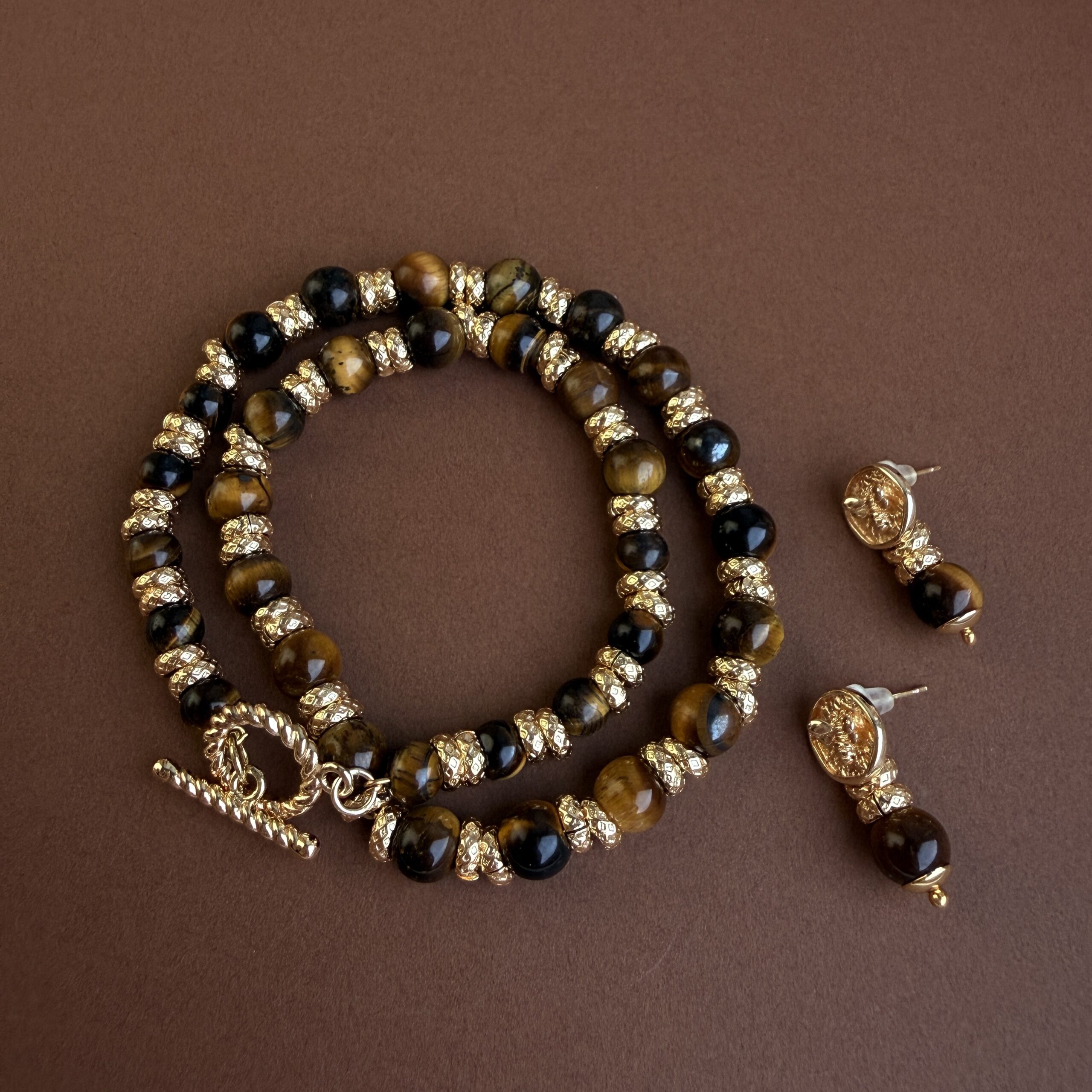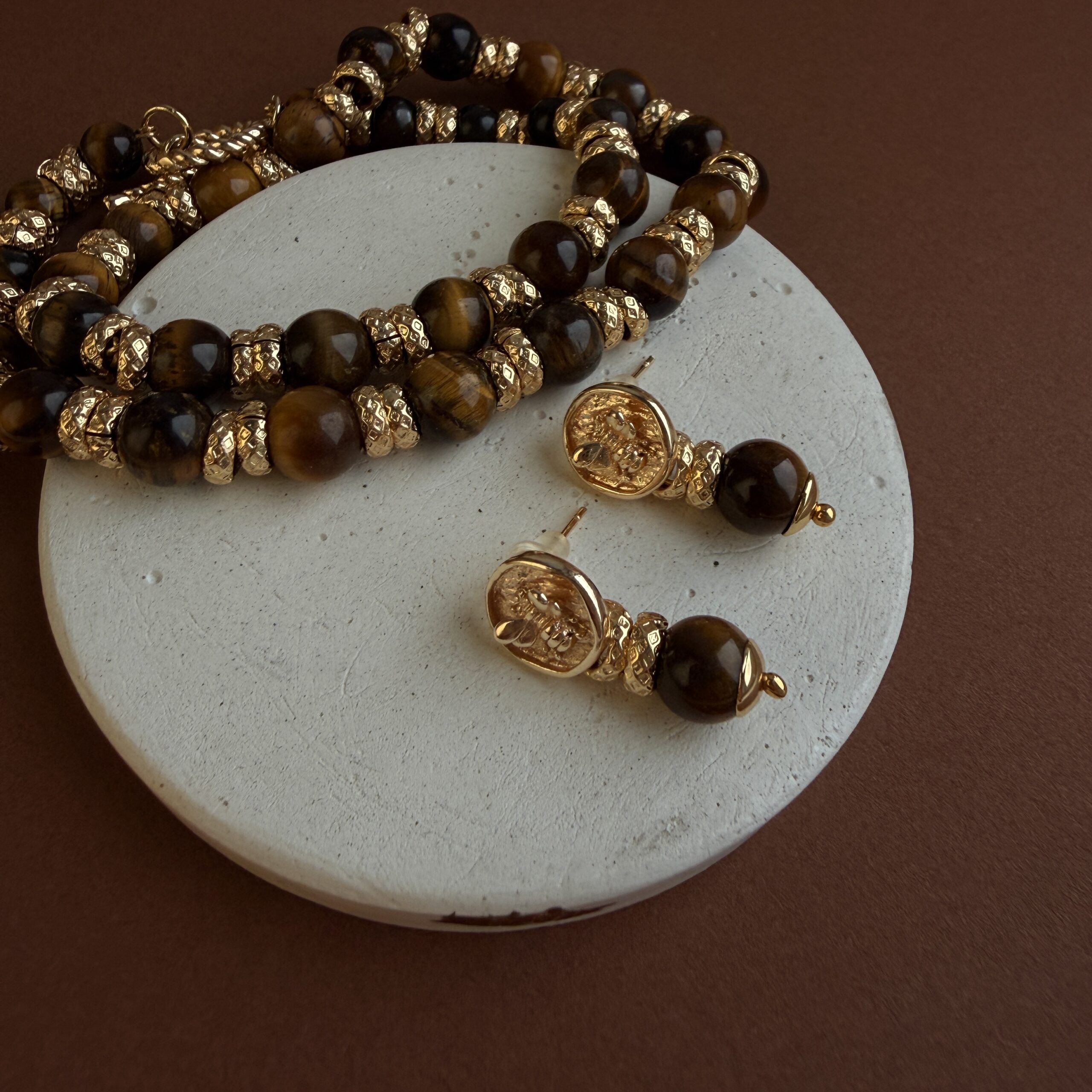 Тёплое сияние тигрового глаза притягивает взгляд своей глубиной и мягкими переливами, а декоративный элемент в форме пчёлки символизирует трудолюбие, изящество и внутреннюю силу.