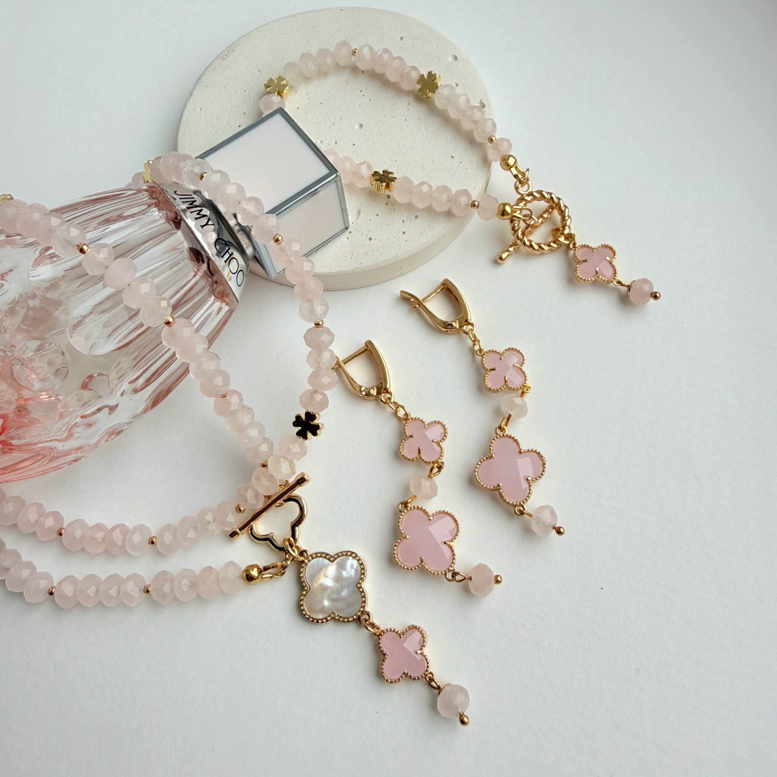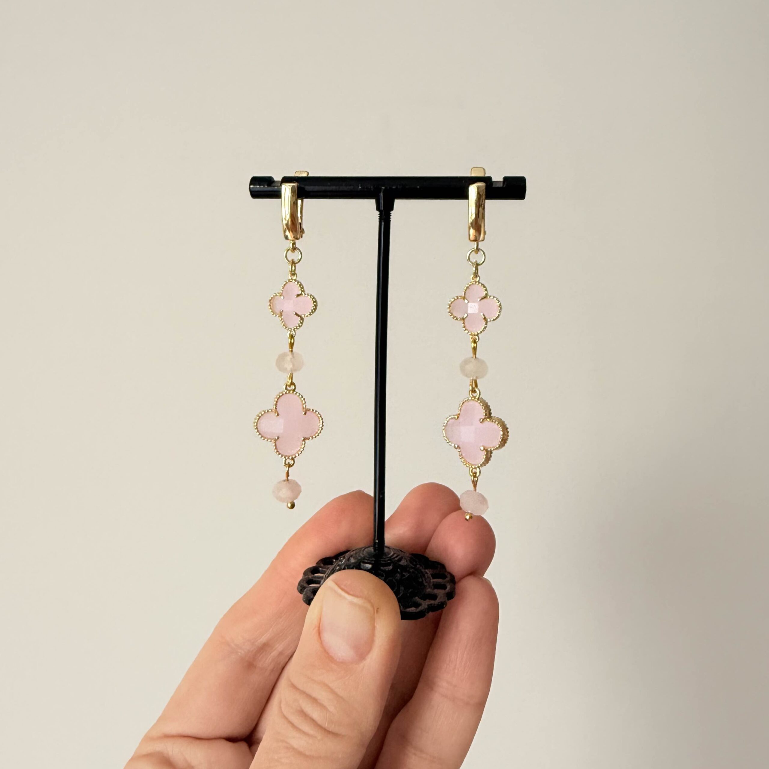 Серьги «Беатриче» в переводе с латинского имя означает «Приносящая счастье, благословенная» — украшение из натурального розового кварца ювелирной огранки и розового стекла с клевером, которое стало настоящим бестселлером Virossa 🤍