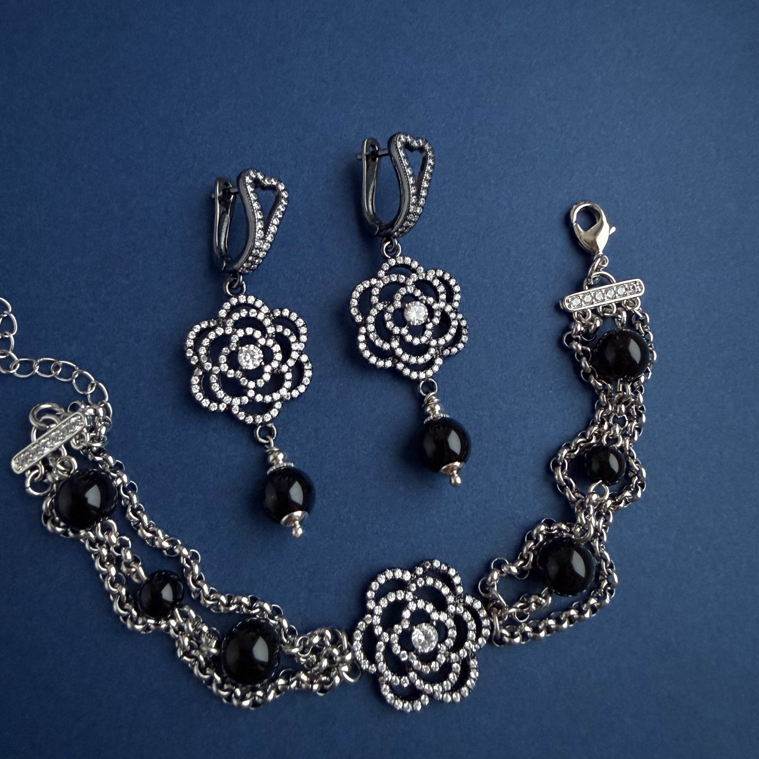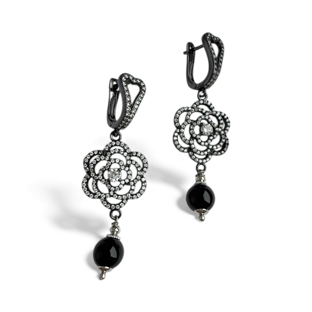 Эти серьги родились легко, как будто сами сложились в изящный танец линий и форм. Ажурные цветы, словно вышитые серебряной нитью, и капля чёрного агата внизу — утончённый штрих, который завершает образ.