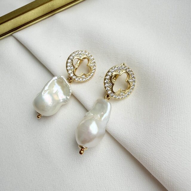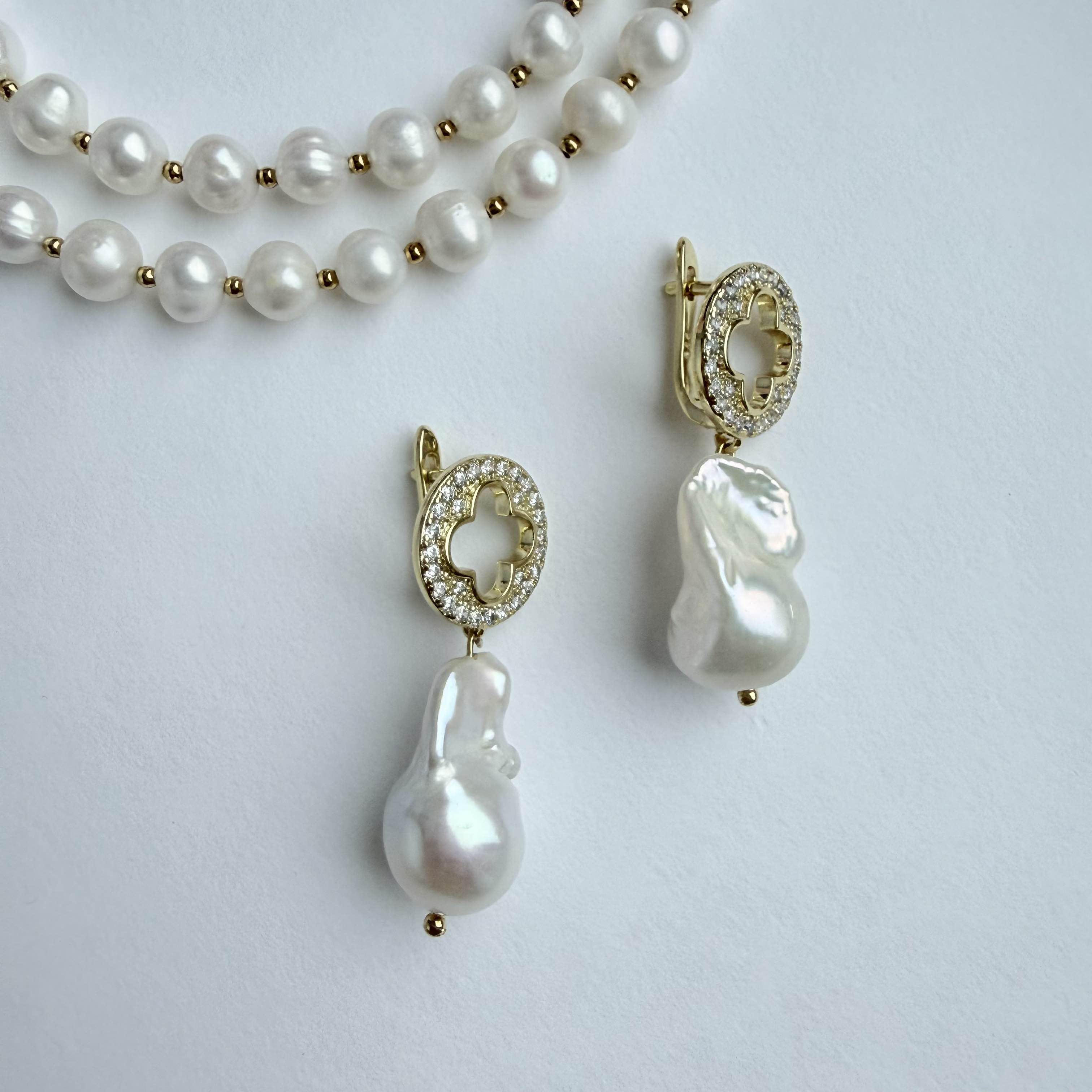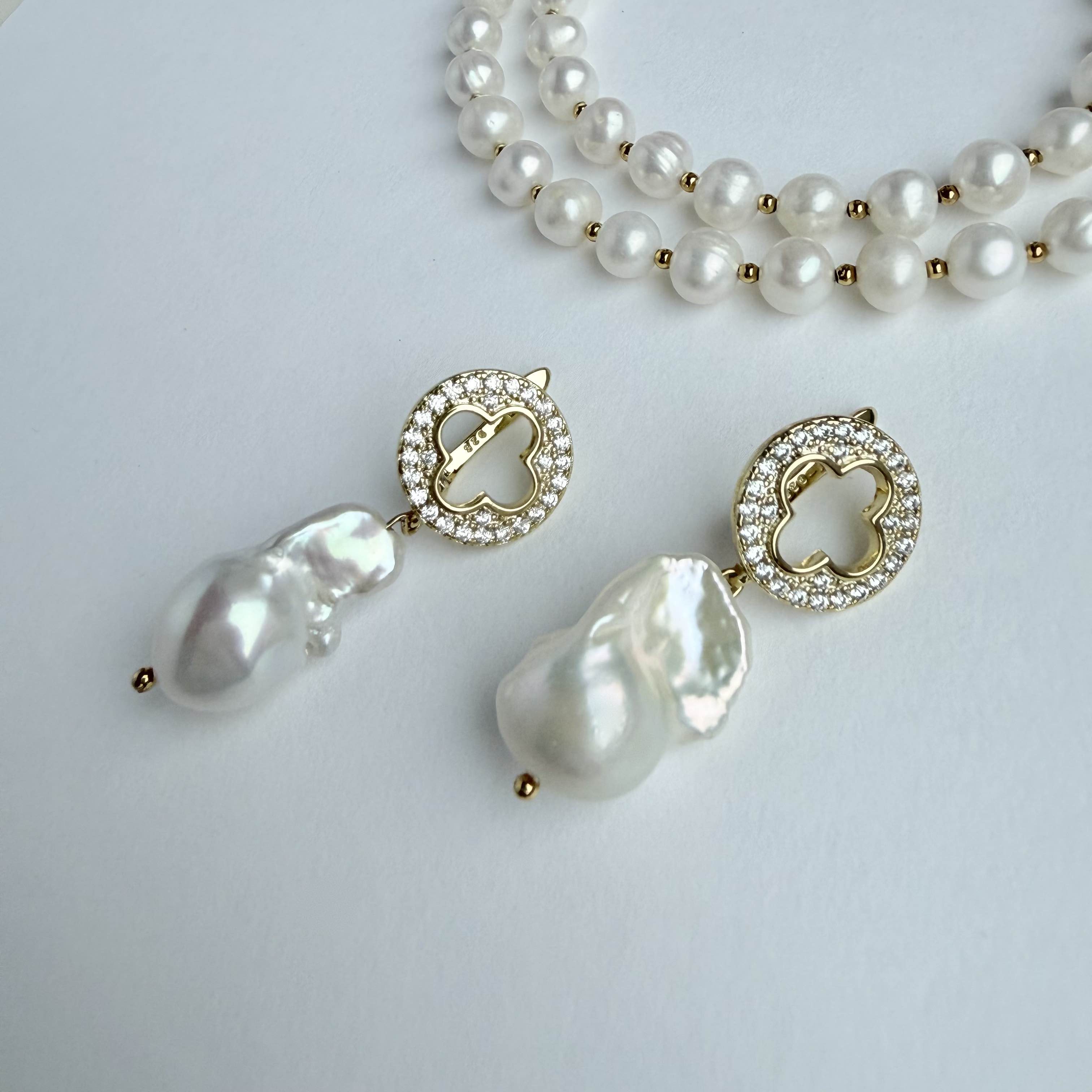 Серьги с фианитами и барочным жемчугом — это сочетание изящного блеска и природной органичности.