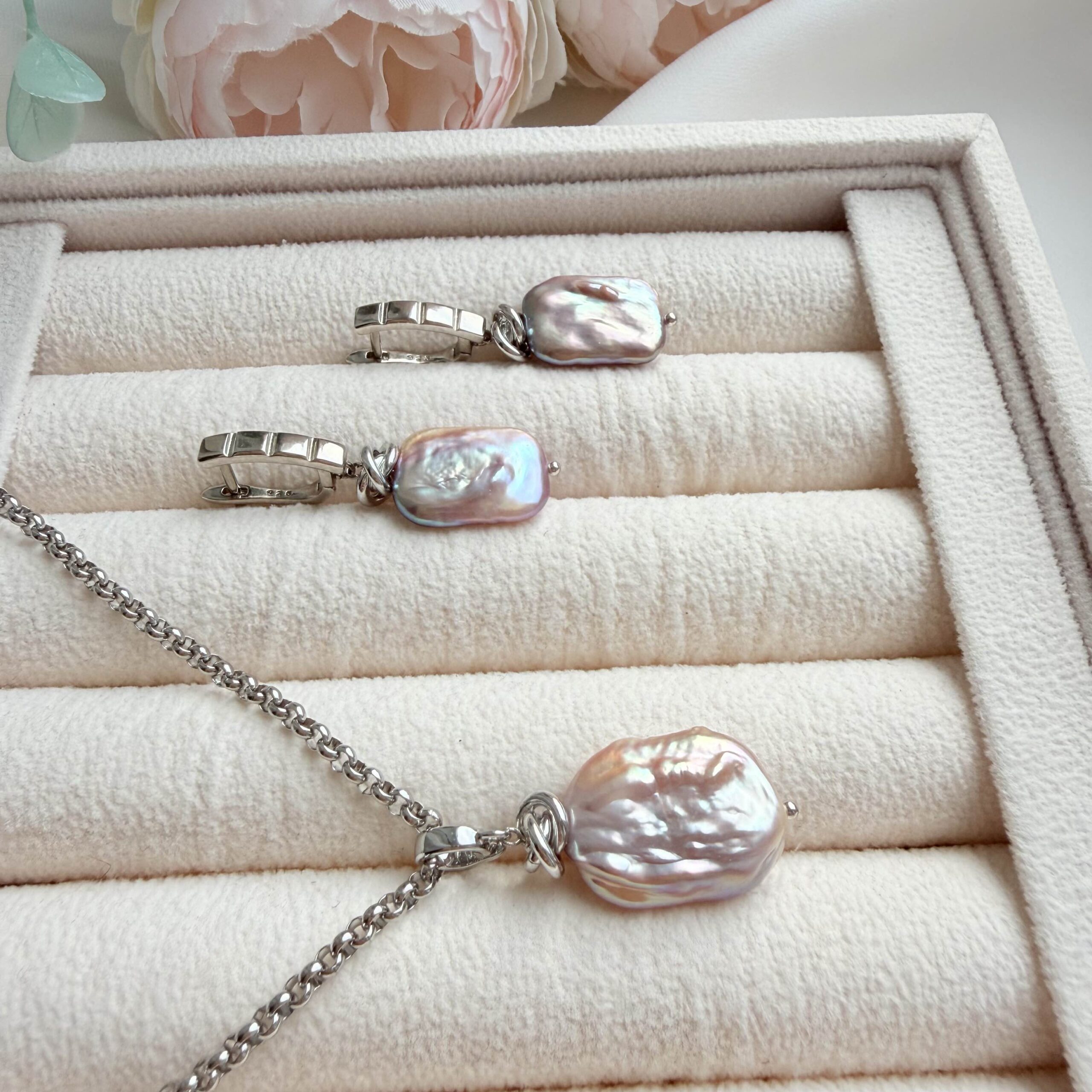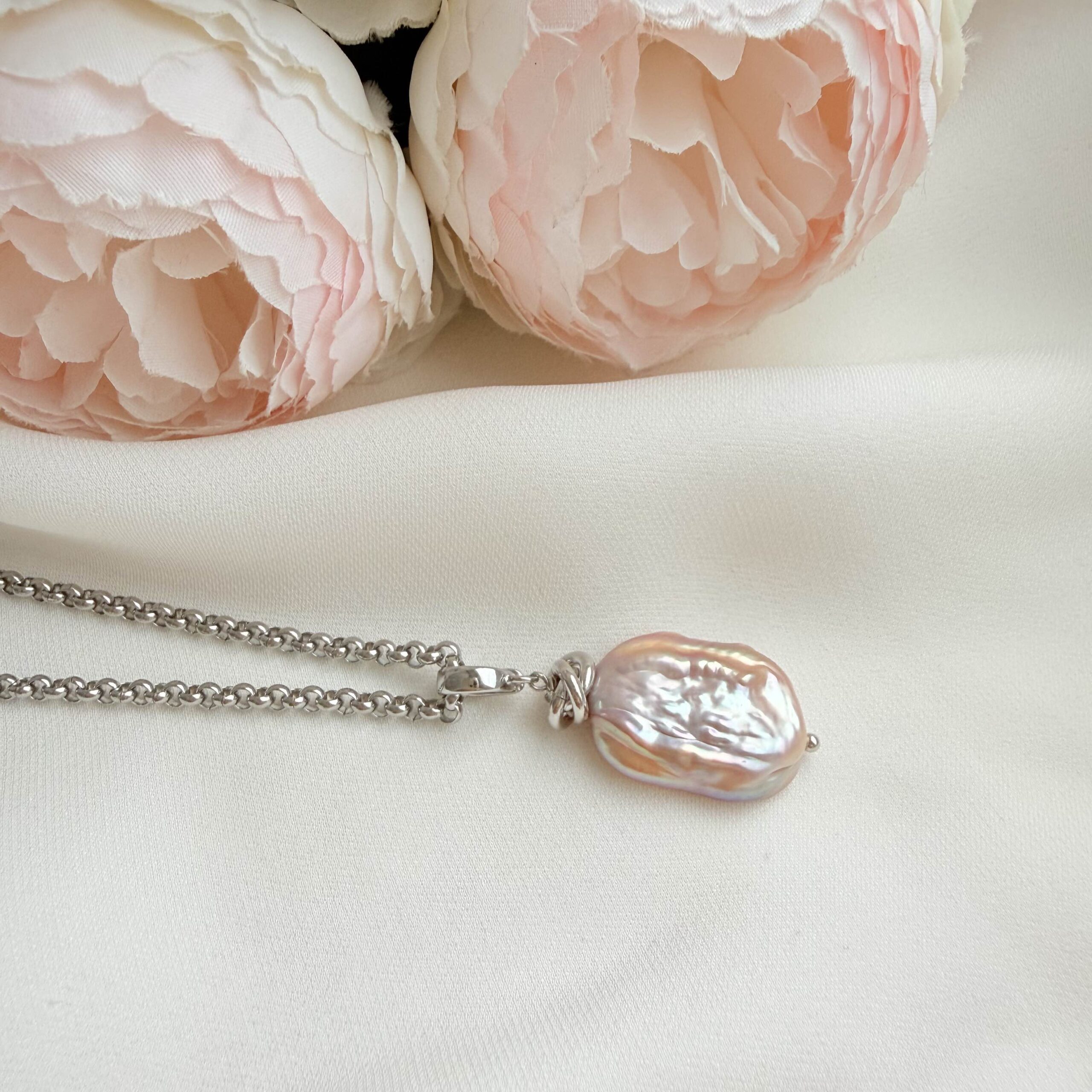 Подвеска выполнена из натурального барочного жемчуга нежно-розового чуть с фиолетовым оттенками с мягкими переливами. Каждая жемчужина уникальна по форме и фактуре, что делает изделие по-настоящему индивидуальным.